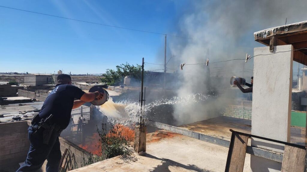 Elementos de la Subsecretaría de Despliegue Policial de la Secretaría de Seguridad Pública del Estado (SSPE), participaron en labores para sofocar un incendio registrado esta mañana en una vivienda de la colonia José Martí, en el Distrito Sur de esta ciudad.