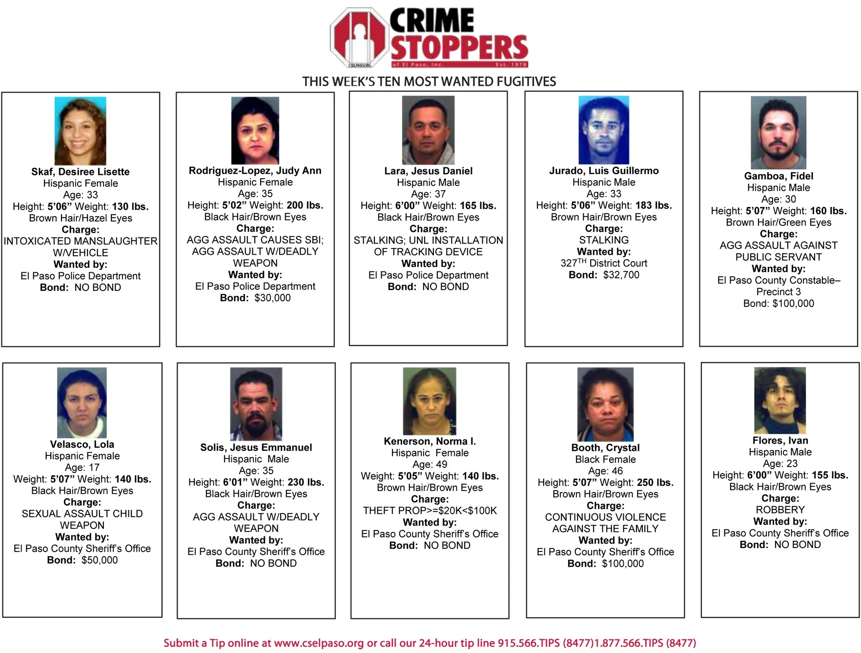 Si tiene información sobre la ubicación de cualquiera de estos fugitivos, llame de inmediato a Crime Stoppers de El Paso al (915) 566-8477 (TIPS) o envíe la información en línea en http://www.cselpaso.org. Su llamada será anónima y, si su información conduce a un arresto, podría calificar para una recompensa en efectivo.