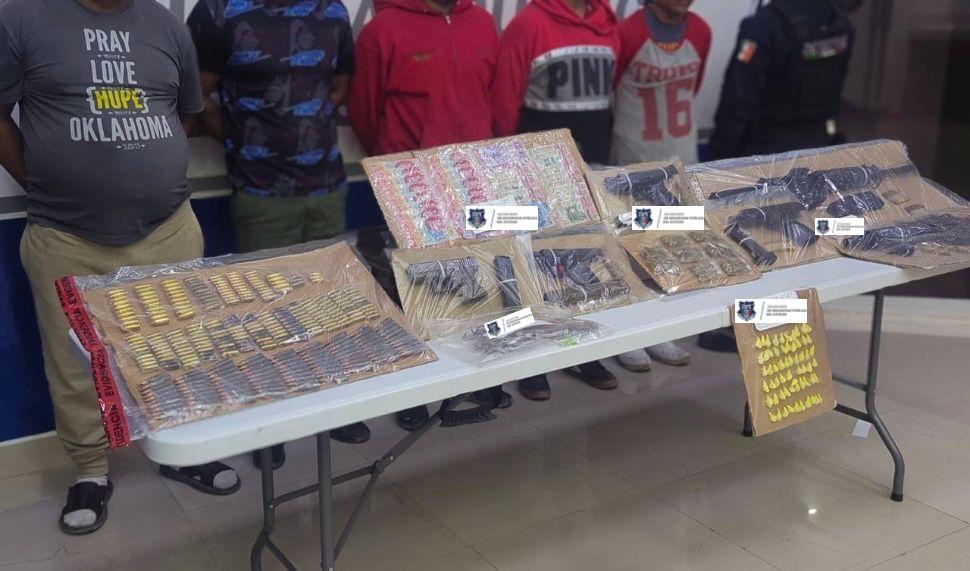 Entre los aseguramientos se encuentran un fusil tipo AR-15, un subfusil semiautomático calibre .380, así como cuatro pistolas semiautomáticas calibres .45, .40, .45 y 9×19.
