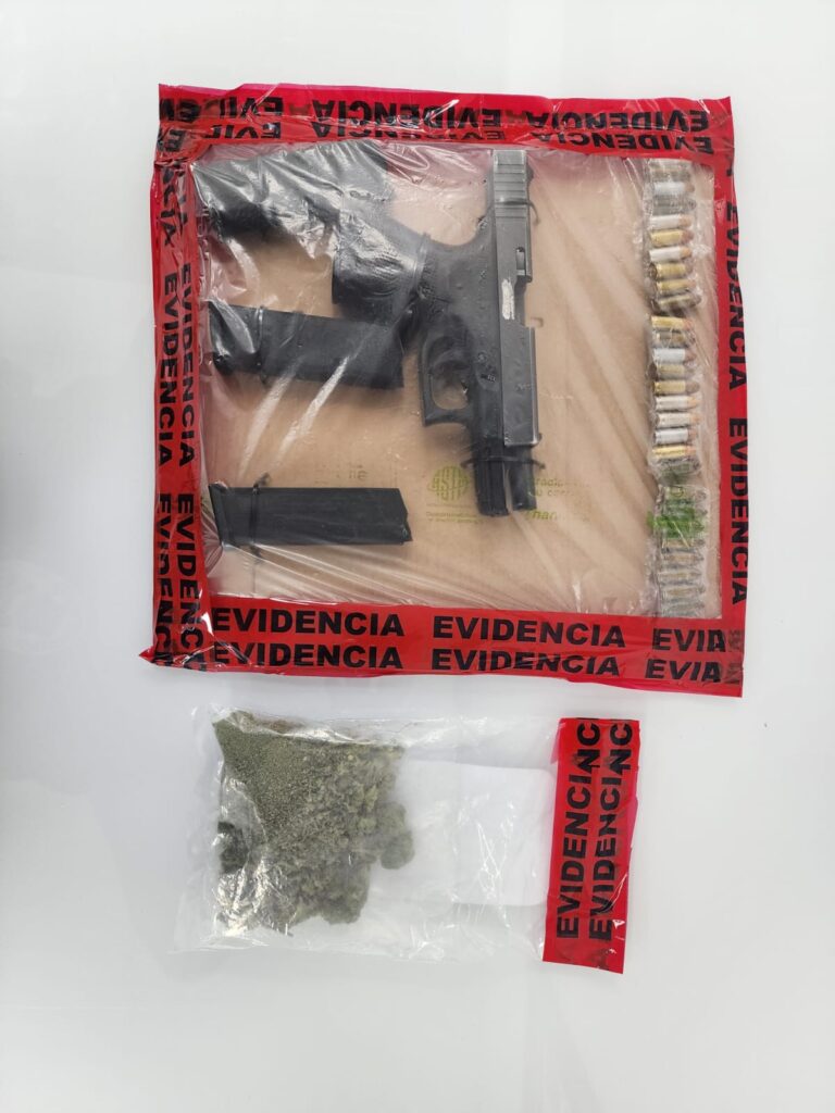 Al ubicar el vehículo en la colonia Ladrilleros y Caleros, los agentes detuvieron a seis personas durante la intervención estratégica, donde se localizó: una pistola 9×19 con los números de serie borrados, tres cargadores con 10 cartuchos útiles cada uno, así como una bolsa con 36 gramos de marihuana.