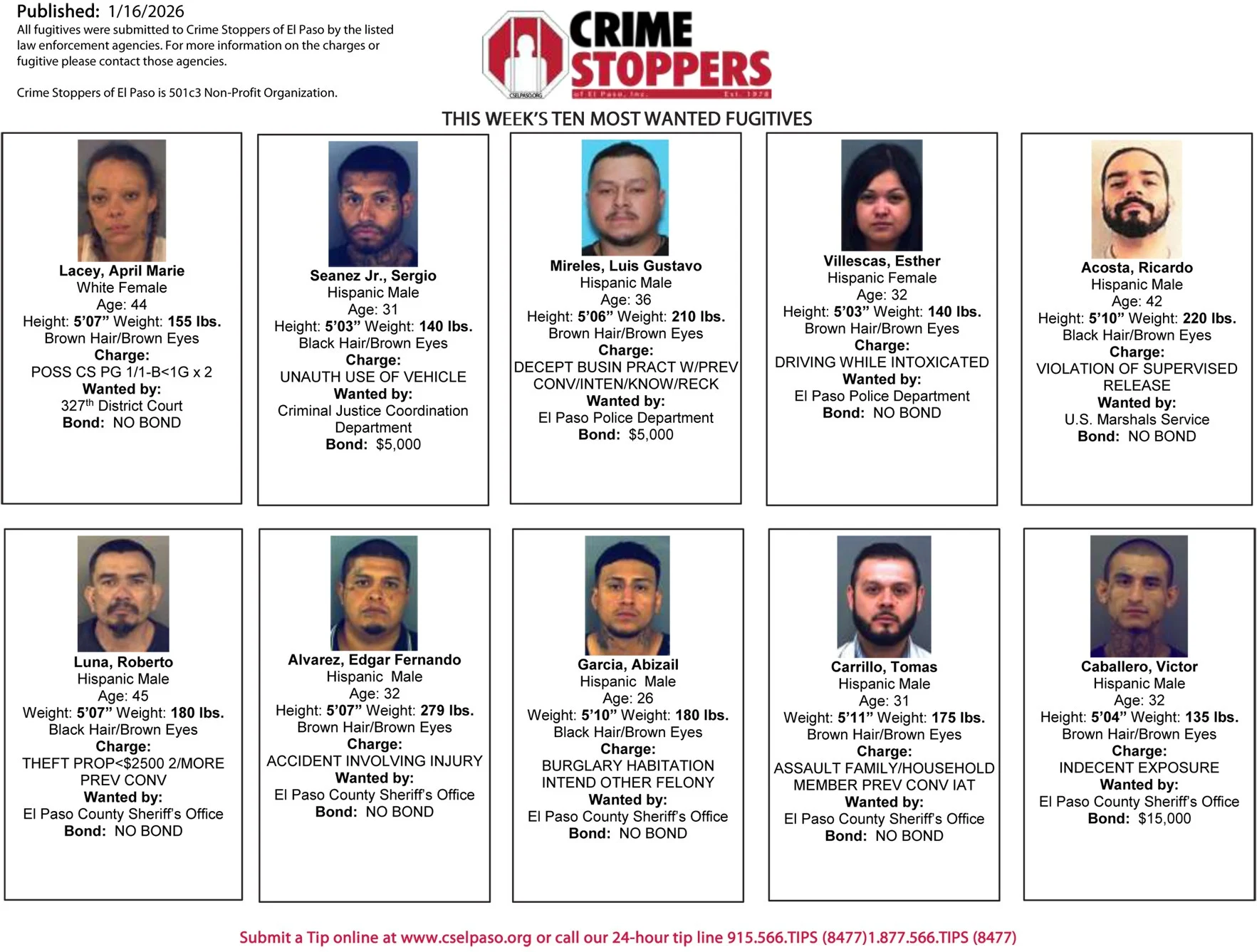 Si tiene información sobre la ubicación de cualquiera de estos fugitivos, llame de inmediato a Crime Stoppers de El Paso al (915) 566-8477 (TIPS) o envíe la información en línea en http://www.cselpaso.org. Su llamada será anónima y, si su información conduce a un arresto, podría calificar para una recompensa en efectivo. Edad: 44 años Estatura: 5 pies 7 pulgadas (1.70 metros)Peso: 155 libras (70 kilogramos)Cabello castaño y ojos cafés Cargo: posesión de una sustancia controlada Sin fianza