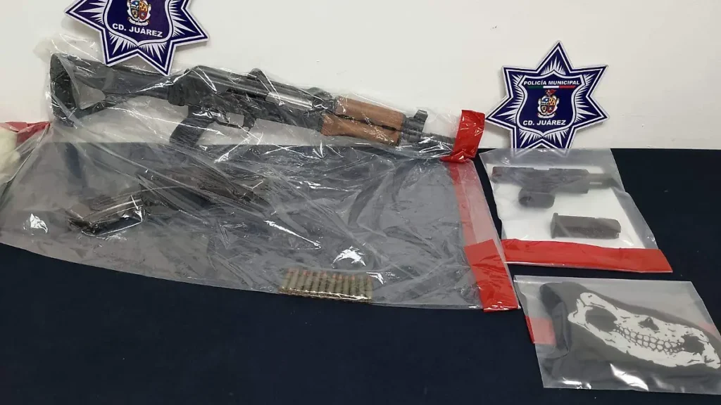 Durante recorridos de vigilancia, los oficiales observaron que de una camioneta tipo pick up descendieron dos sujetos, uno de los cuales portaba lo que parecía ser un arma de fuego envuelta en una tela verde Ante esta situación, los individuos fueron interceptados en el cruce de las calles David Herrera Jordán y Moctezuma, donde se realizó una inspección preventiva. En el lugar, los agentes aseguraron un fusil de asalto calibre 7.62×39, conocido como “cuerno de chivo”, dos cargadores unidos con cinta adhesiva —uno de ellos abastecido con 12 cartuchos útiles—, así como una pistola calibre 9 milímetros con un cargador desabastecido.