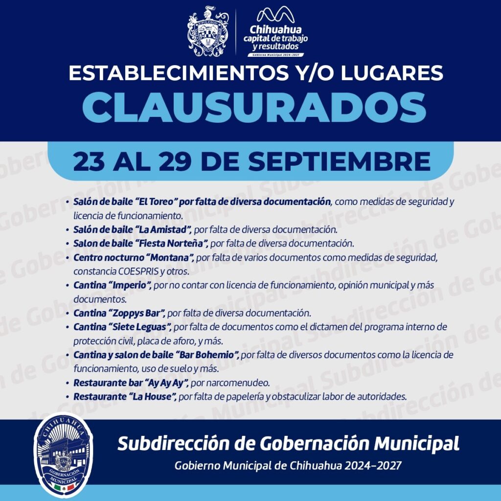 Gobierno Municipal de Chihuahua, a través de la Subdirección de Gobernación de la Secretaría del Ayuntamiento, informa que del 23 al 29 de septiembre se realizaron 261 inspecciones a locales y establecimientos, resultando en 26 actas administrativas por la falta de documentación diversa, así como 10 clausuras en total.