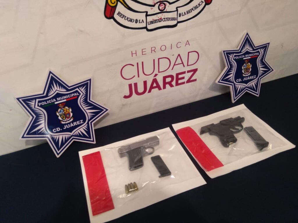 Los oficiales le realizaron una inspección preventiva por protocolos de seguridad, en donde localizaron en medio de los asientos delanteros del automotor dos armas de fuego, una calibre 380, con un cargador desabastecido y otra calibre 25, con un cargador abastecido con cuatro cartuchos útiles, procediendo con su detención.