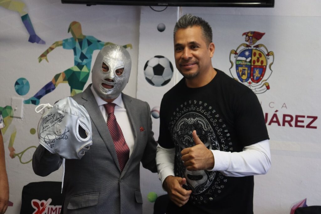 Enmascarado de Plata, quien visitó Ciudad Juárez esta semana, y volverá para reinaugurar el Gimnasio Municipal Josué Neri Santos en diciembre.