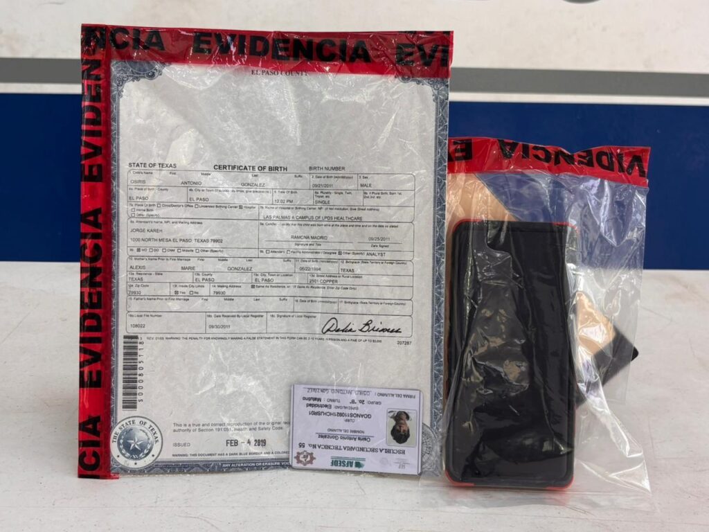 Durante la intervención también se aseguraron diversos documentos en original y copia a nombre de distintas personas, presuntamente de nacionalidad estadounidense, entre ellos actas de nacimiento, licencias y tarjetas de seguro social, de las cuales algunas presentaban inconsistencias y al menos dos fueron confirmadas como documentos falsos.