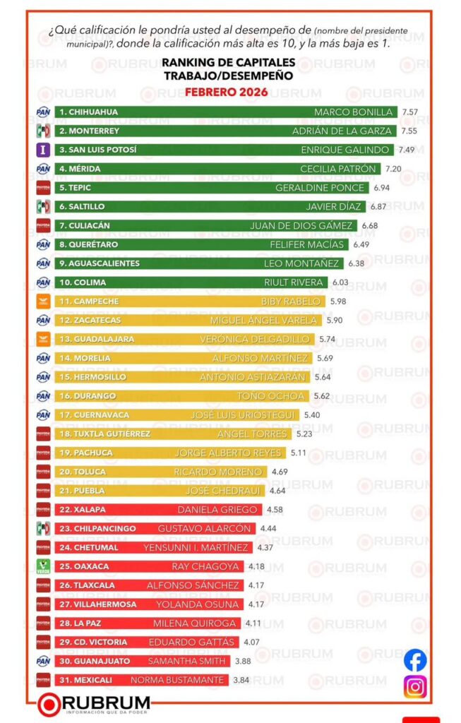 La casa encuestadora RUBRUM dio a conocer su evaluación correspondiente al mes de febrero, en la que Marco Bonilla, alcalde de Chihuahua Capital, se mantiene como el mejor evaluado del país en el rubro de trabajo y desempeño, al encabezar la medición entre las 31 ciudades capitales.