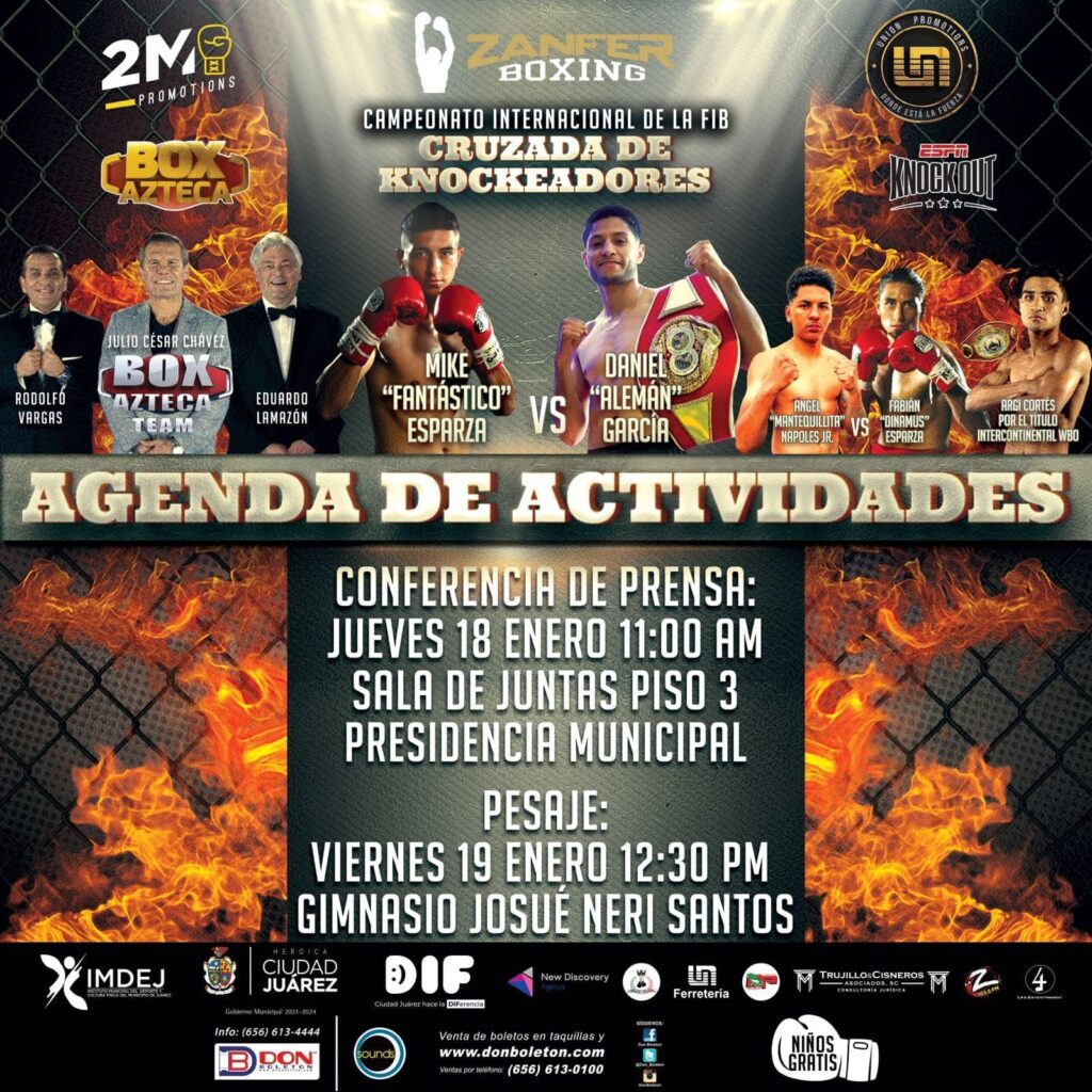 El juarense y oriundo de la colonia obrera Miguel “Fantástico” Esparza, disputará el campeonato Internacional de la Federación Internacional de Boxeo, contra el avecinado en Ensenada Baja California Daniel “Alemán” García, a diez rounds.